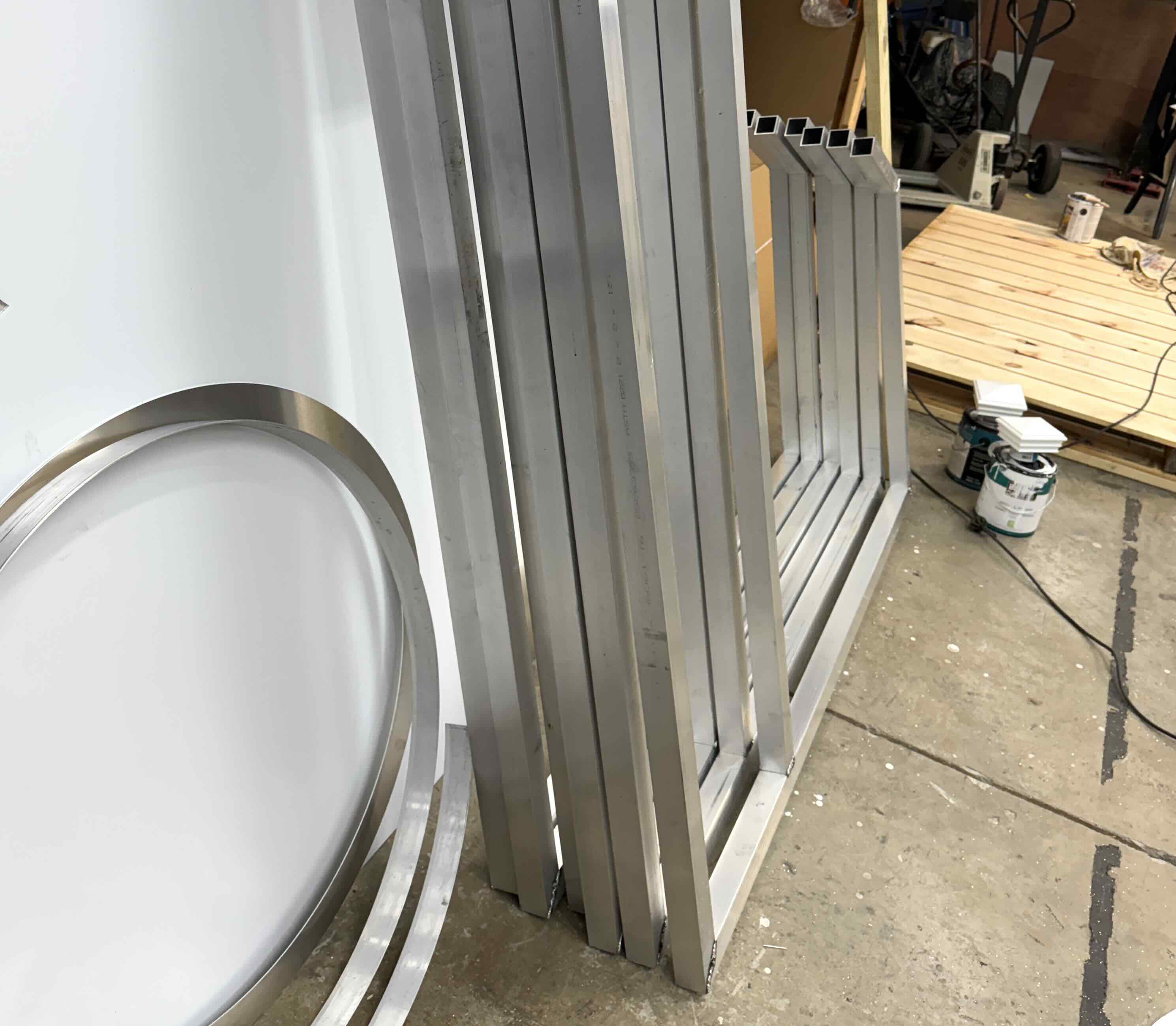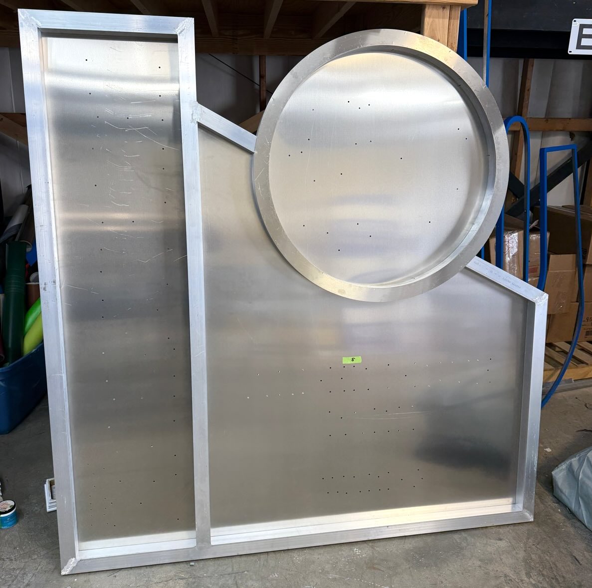 Then a sheet of aluminum with holes drilled in various places was attached to the back. Small mounting pegs will be slid through each hole and then letters will be attached to them.